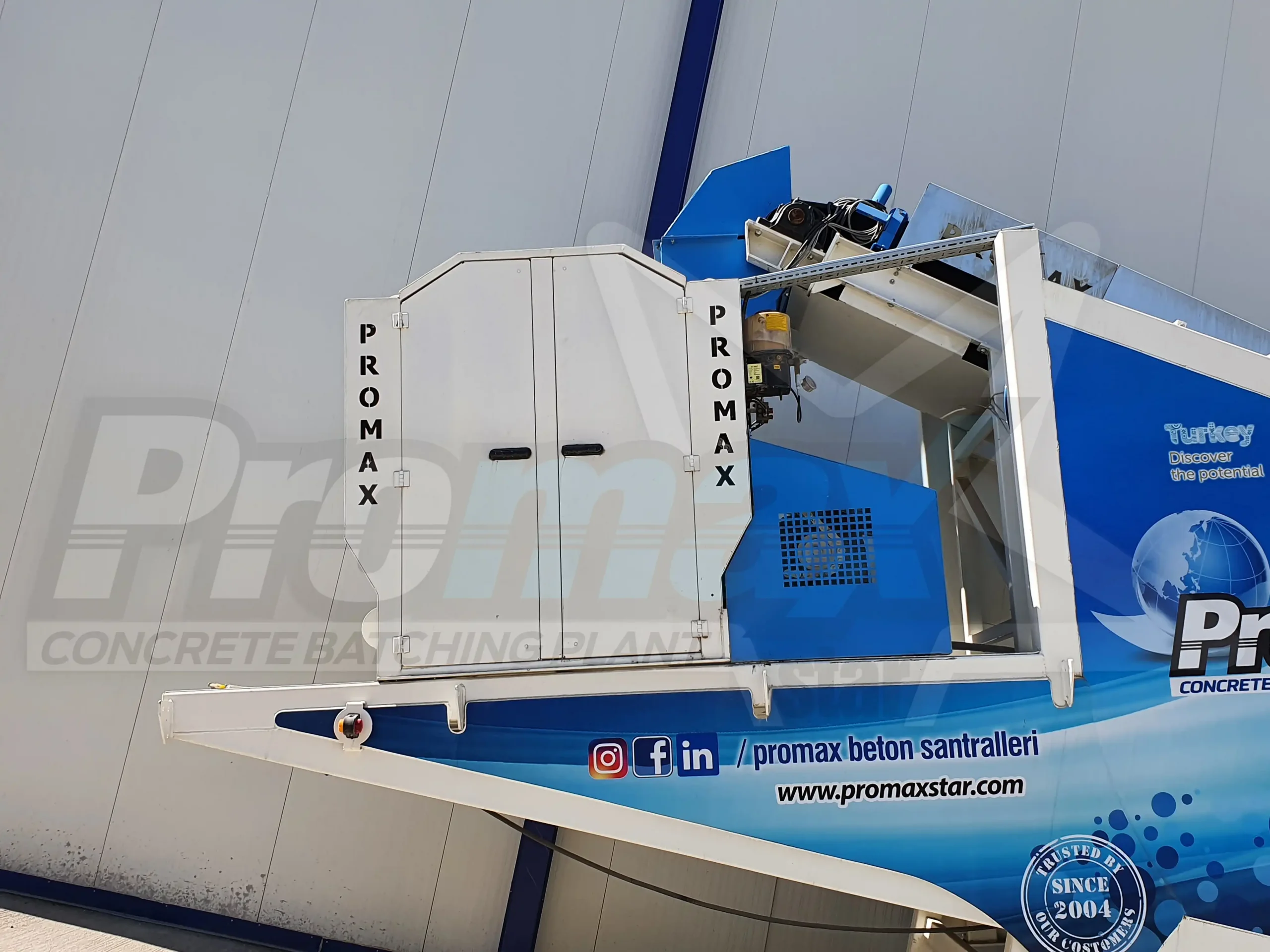 Mobilna betoniarnia Promax o wydajności od 30 m³ / h do 120 m³ / h do produkcji betonu;  Produkty mobilne zmieniły zwyczaj niskiej zdolności produkcyjnej, a pojemność dysku mobilizację wykorzystać moc łączenia roślin w konkurencji.